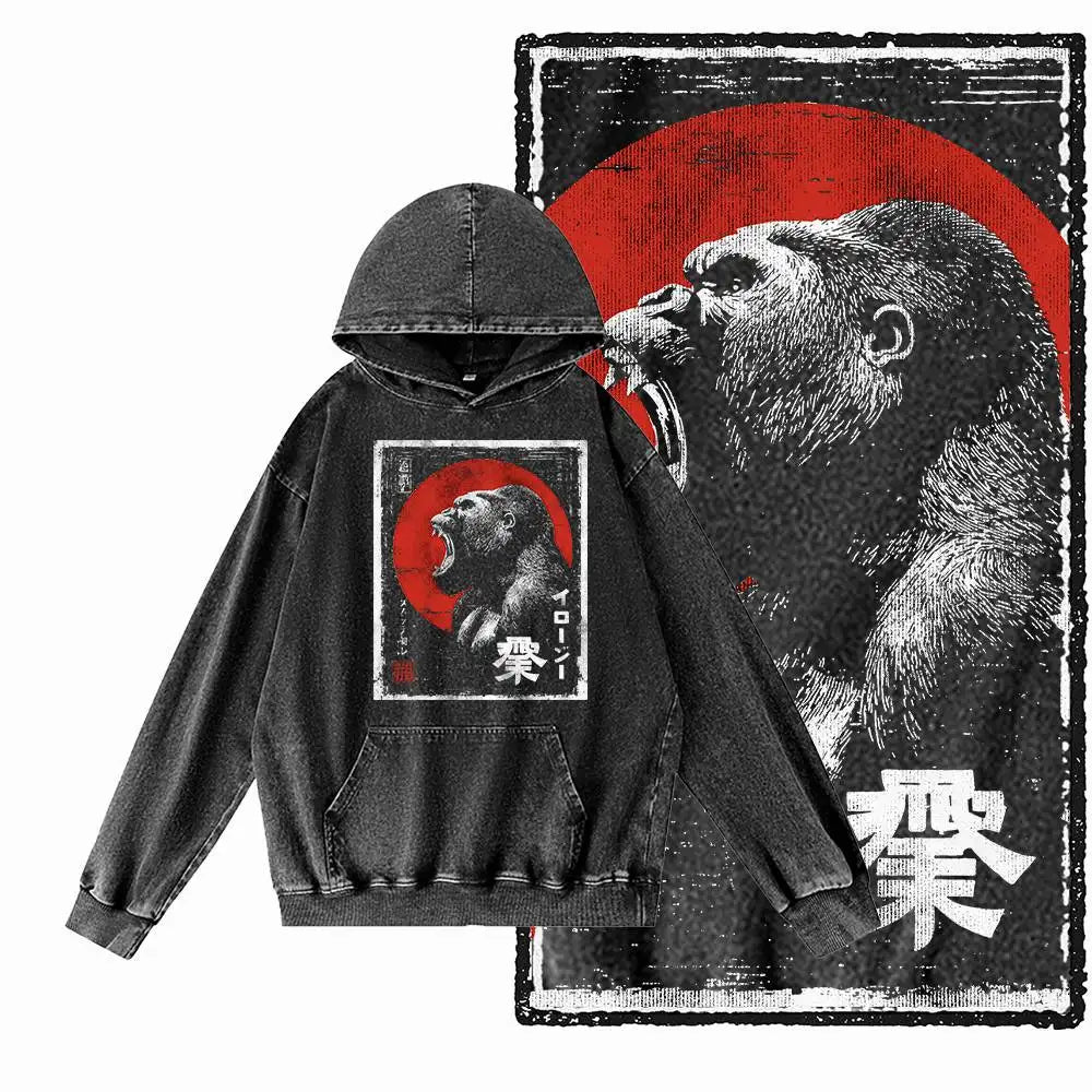 Un hoodieoversize que es a la vez cómodo y una declaración de estilo, perfecto para los amantes de la cultura asiática y el streetwear con un fuerte sabor vintage y gráfico.